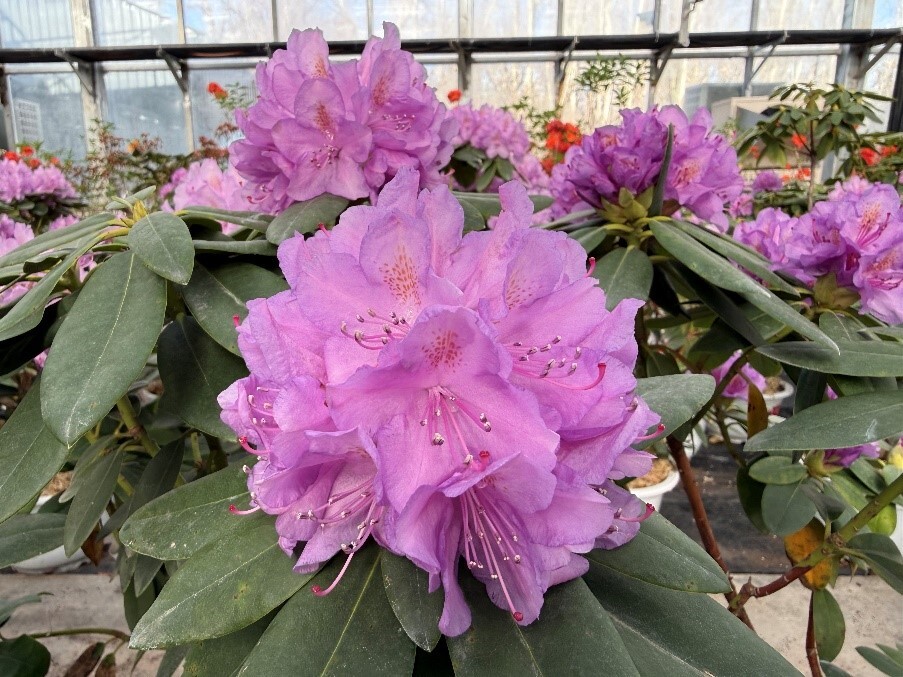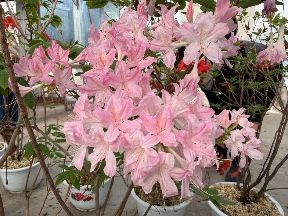 目前,伊犁-吐鲁番植物园目前已收集杜鹃属植物50余种(品种)。本次展览主要展出落叶杜鹃与常绿杜鹃的部分园艺品种,其中常绿杜鹃“凯特”“优雅”当前开花较为旺盛,落叶杜鹃“金星”“粉容”“朱莉”等品种也各具风姿,展现出杜鹃花丰富的园艺观赏价值。